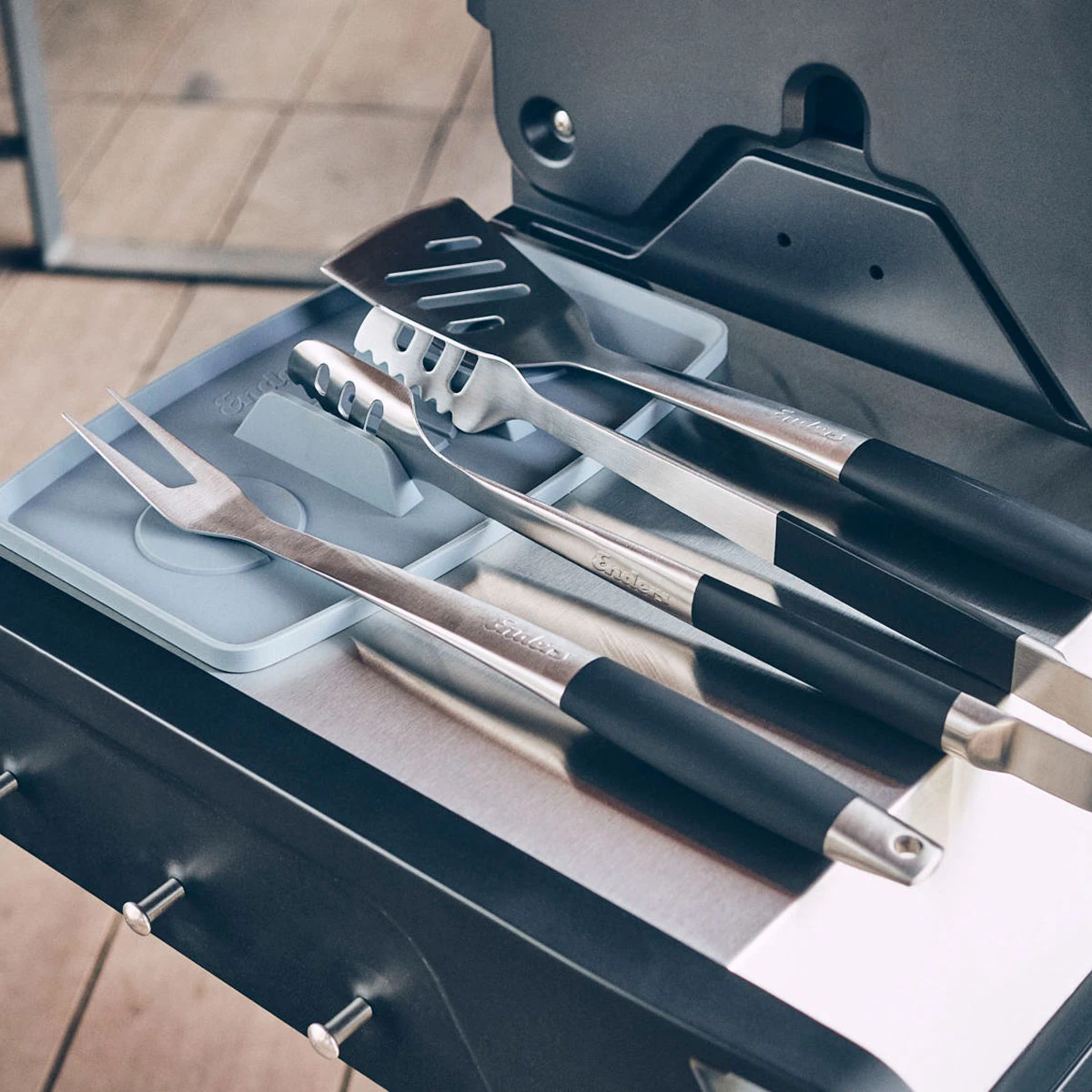 Mit der Besteckablage aus Silikon könnt Ihr sicher sein, dass Eure Grillstation ohne Kratzer und Verschmutzungen bleibt. Sie schützt den Grill und lässt Ihn zusätzlich noch cooler aussehen! Das Material saugt sich auf glatten Untergründen fest, so dass nichts verrutscht – perfekt für die Seitenablage Eures Grills. Besonders praktisch: Die integrierte Einspannmöglichkeit der Silikon-Ablage verhindert das ungewollte Aufspringen der Grillzange.