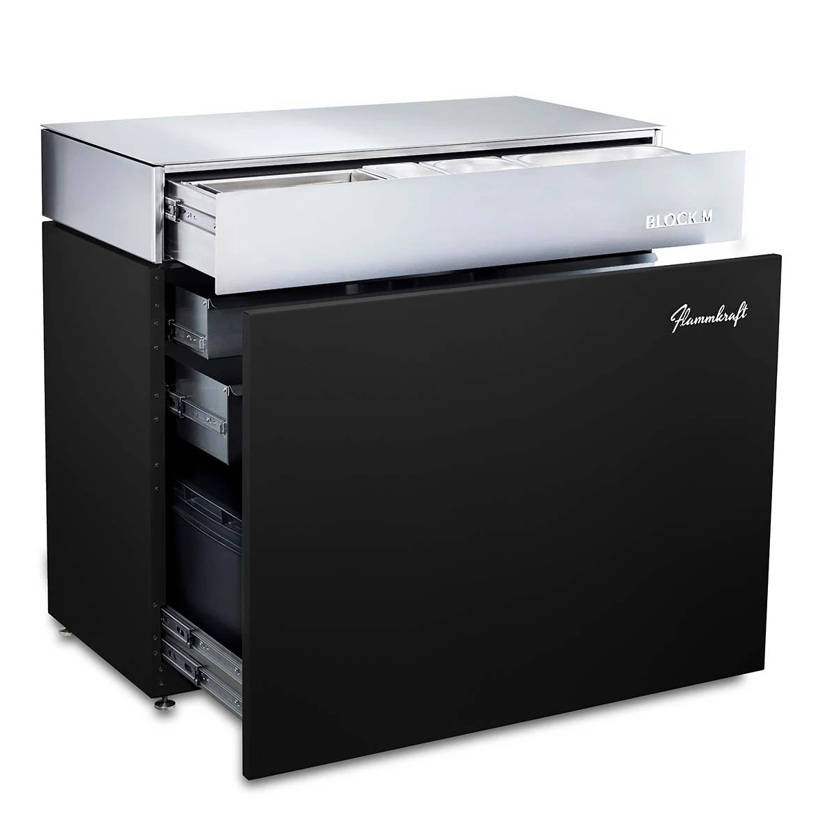 Der Block M ist ein aus 100% Edelstahl, in der Grundfläche entspricht er dem Block D und ist in den gleichen Farben erhältlich. Neben umfangreichen für Zubehör bietet der Block M einen Abfallbehälter und eine komfortable Lösung für die Vorbereitung und Bereitstellung von Zutaten.