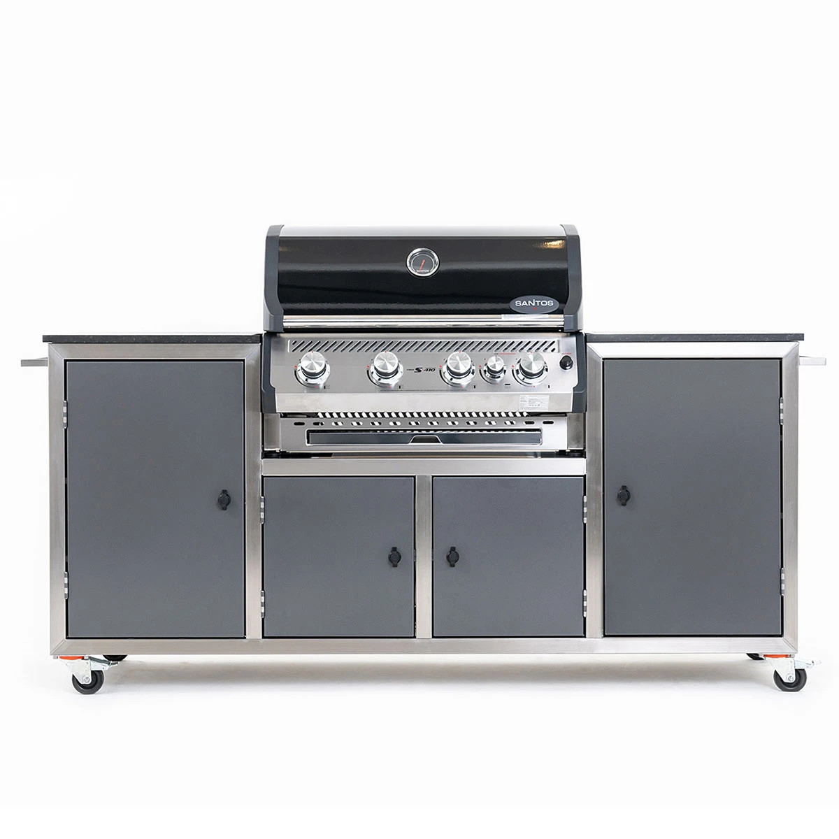 Die Kombination aus Premium Gasgrill, Arbeitsfläche und Stauraum macht die Gasgrillstation zur hochwertigen Außenküche aus einem Guss – mit reichlich Platz zum Schneiden, Würzen und Mischen sowie Staufläche für Zutaten, Grillgut, Zubehör und Gasflasche, welches hinter den dekorativen Fronten verschwindet. Der schwarze SANTOS Gasgrill, umrahmt von einer massiven Granitarbeitsfläche, lässt jedes Grillerherz höher schlagen.