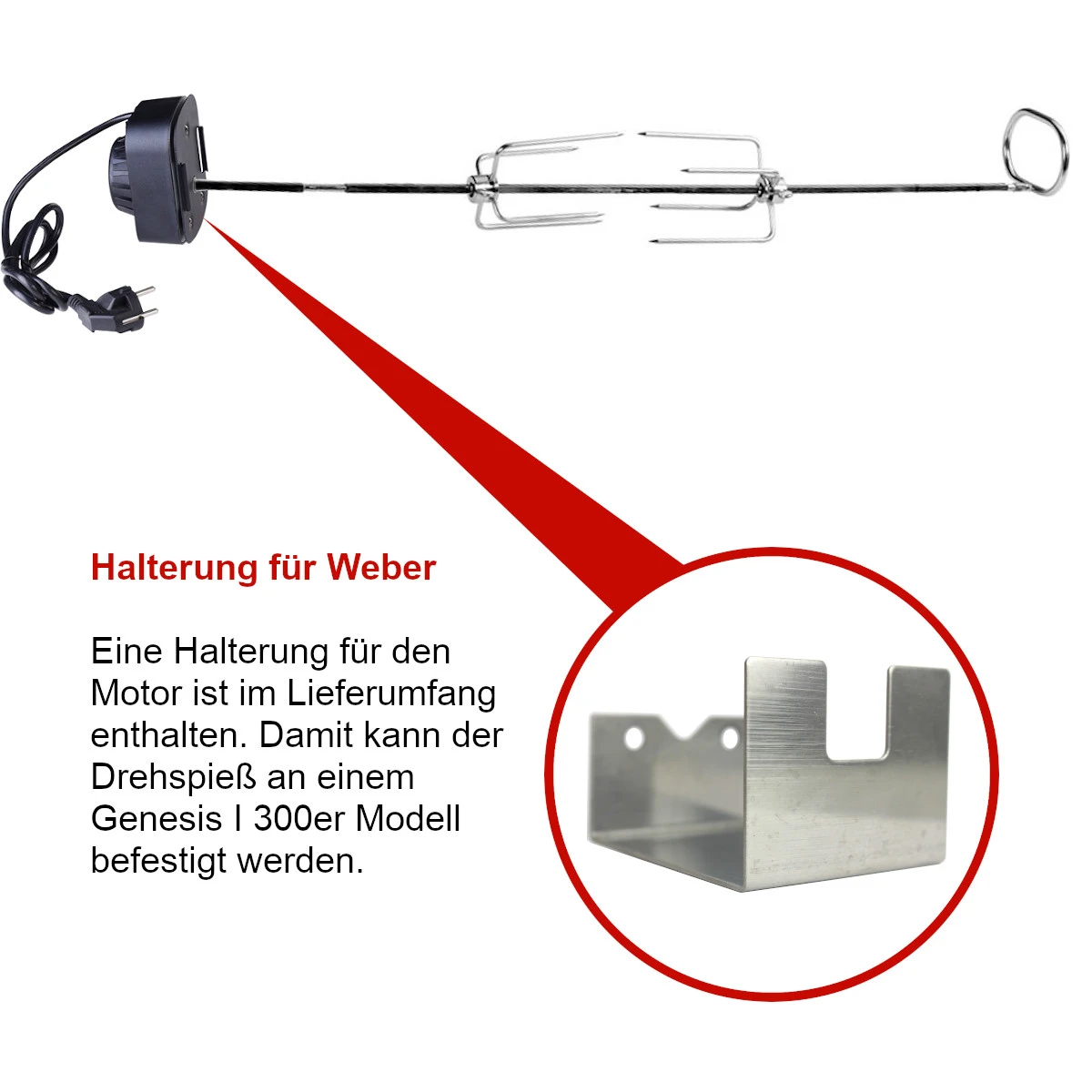 Um Euren Gasgrill in ein Rotisserie-Grill zu verwandeln, müsst ihr lediglich die Grill- und Warmhalteroste aus der Grillkammer entnehmen. Anschließend die Motorhalterung mit den beigelegten Schrauben befestigen. Jetzt nur noch den Stecker einstecken und der Spieß kann losdrehen.