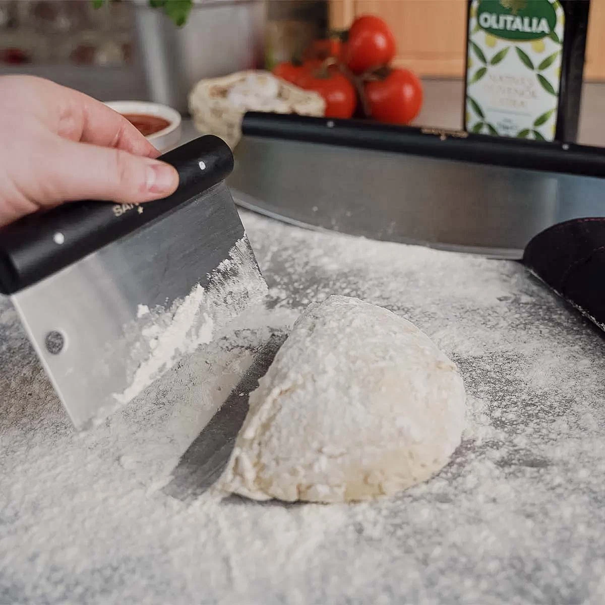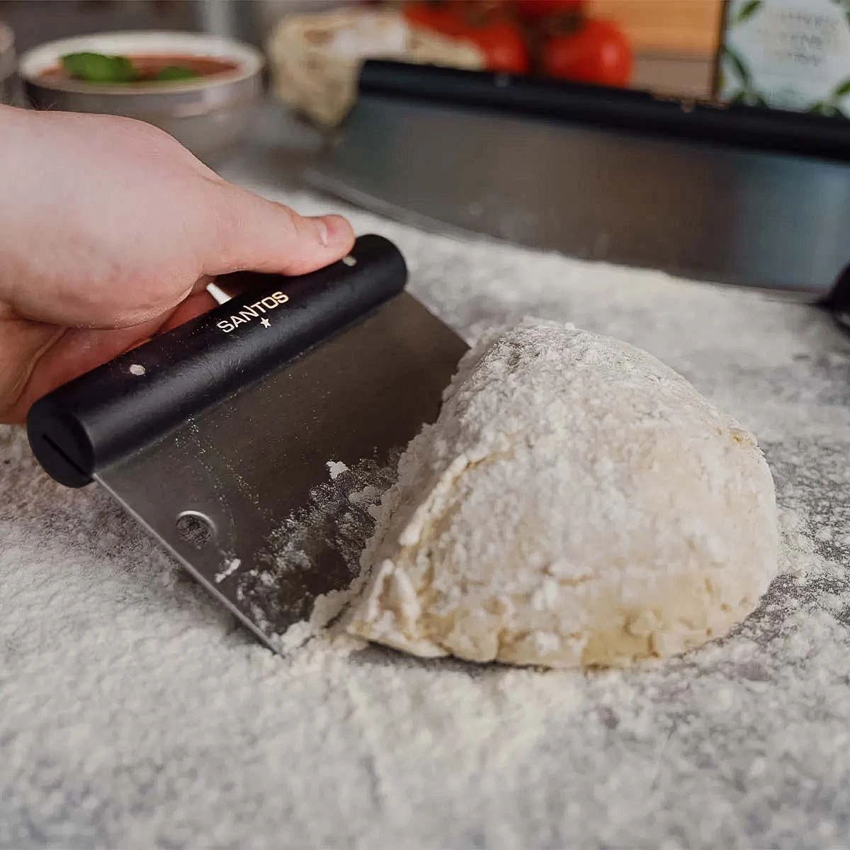 Wer gerne Pizzateig, Flammkuchen und Brot zubereitet, kennt das Problem: Bei der Verarbeitung von Teig kann es sehr klebrig zugehen, der Teig haftet entweder an den Fingern oder klebt an der Arbeitsfläche fest. Mit dem professionellen Teigschneider von SANTOS wird Euch das des Teigs wesentlich erleichtert.