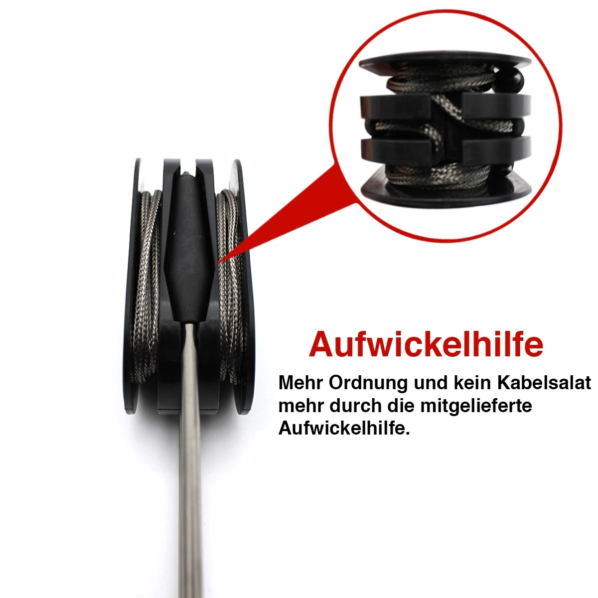 Das Thermometer hat Anschlüsse für vier Temperaturfühler. Die Temperaturfühler haben am Schaft einen rutschhemmenden Silikon-Griff für ein einfaches Handling. Die Silikon-Griffe sind bis 300 °C hitzebeständig. Mit den Metallklammern werden die Temperaturfühler sicher und sauber auf dem Grillrost platziert.