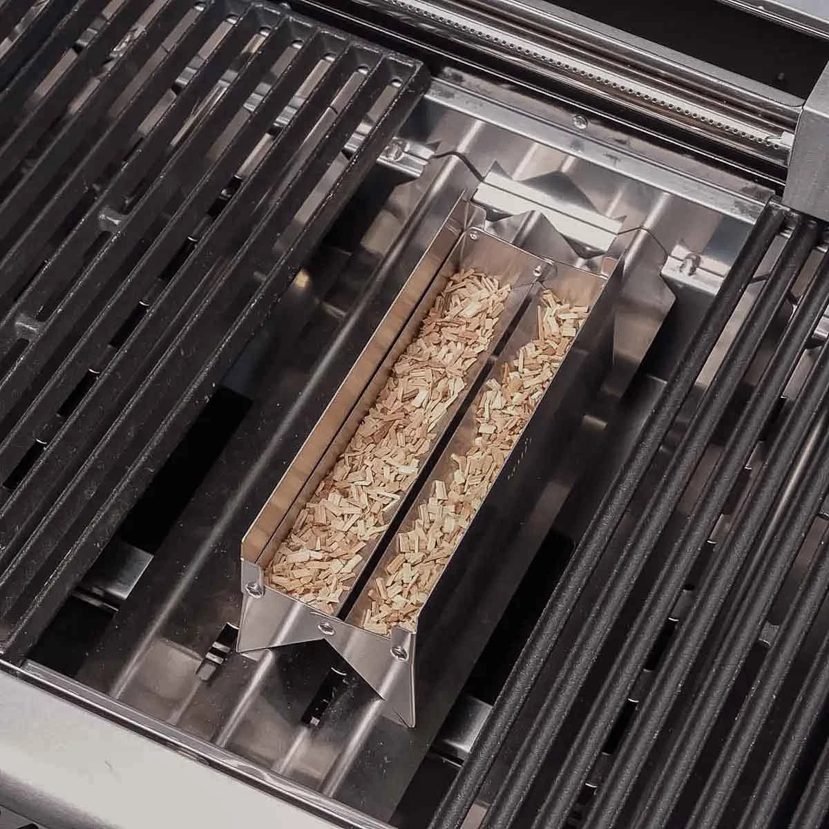 Die gefüllte Räucherbox wird platzsparend direkt auf den Waves (Flammverteiler) Eures Gasgrills positioniert – so bleibt auf dem Grillrost mehr Platz für Euer wertvolles Grillgut.