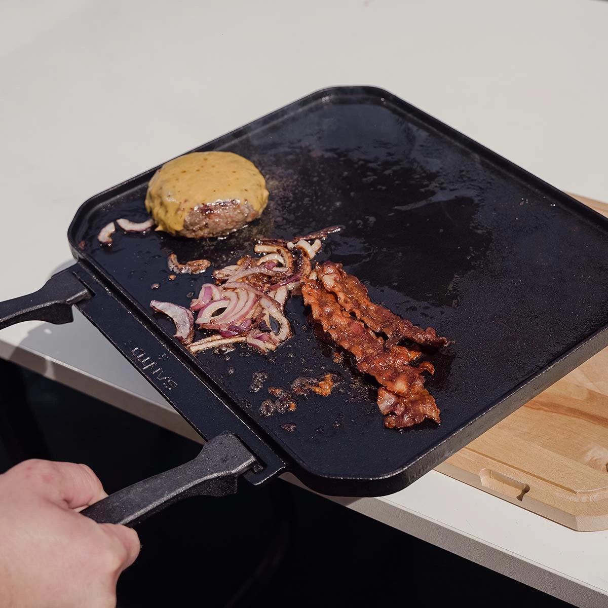 Ob Kohle- oder Gasgrill, Induktions-, Gas- oder Elektroherd, Backofen oder Lagerfeuer – die robuste Grillplatte aus Gusseisen versorgt Euch überall mit köstlichen Röstaromen und optimalen Bratergebnissen. Sogar auf dem Infrarot-Keramikbrenner könnt Ihr sie verwenden: Wichtig dabei ist, dass der Brenner-Bereich nicht abgedichtet ist, alternativ lässt sie sich auch auf einen erhöhten Rost legen.