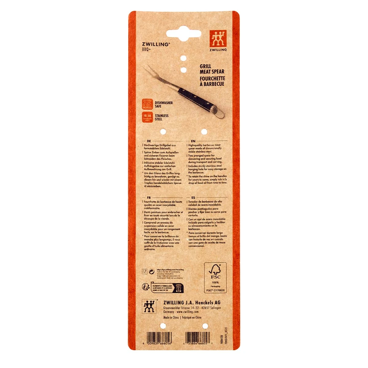 ZWILLING BBQ+ Grillgabel ist der ideale Helfer, um Eure perfekt gegrillten Steaks und andere Köstlichkeiten vom Grill meisterlich zu servieren. Die Zinken der Edelstahl Grillgabel sind schön lang und geben Euch einen beim Servieren. Die 40 cm lange Grillgabel besteht aus hochwertigem, und ist dadurch robust, hygienisch und langlebig. Eine perfekte Kombination in hochwertiger Qualität made by ZWILLING.